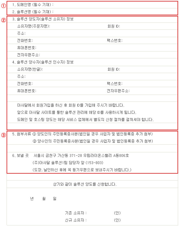 ① 양도할 도메인명과 솔루션명을 정확히 기재해 주시기 바랍니다. (도메인이 변경되었다면 변경 전, 변경 후 도메인을 모두 기재해 주십시오.) ② 양도자와 양수자의 정보를 빠짐없이 정확히 기입하여 주십시오. ③ 추가 첨부 서류를 반드시 동봉하여 아래의 주소로 등기(우편) 발송해 주시기 바랍니다. ※ 서울시 금천구 가산동 371-28 우림라이온스밸리 A동 802호 (주)아사달 솔루션몰 양도양수 담당자 앞 (문의전화: 02-2026-2060, 팩스: 02-2026-2008, 이메일: solution@asadal.com) |